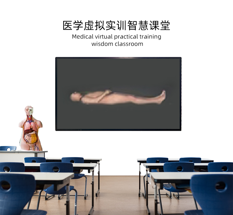 醫學虛擬實訓智慧課堂采用零貼合技術和電容觸控技術,4K 高清顯示屏,搭載數字化三維技術,虛擬人體結構解剖系統。觸屏交互操作,觸控操作可實現不同方位和層次人體結構的任意角度剖切、觀察。將人體解剖學、局部解剖學、斷層解剖學的知識融合起來 ,幫助醫學教育建立三維空間,實現互動體驗醫學教學。