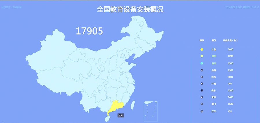 設(shè)備集控軟件,用于教學(xué)設(shè)備的班、校、縣、市、區(qū)、省的逐級(jí)管理。教育部門(mén)可以通過(guò)設(shè)備集控軟件中的設(shè)備地圖查看本地區(qū)所