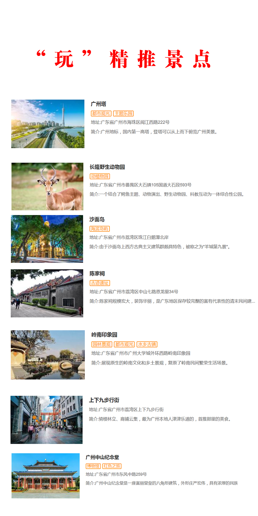 "廣州的景點(diǎn)怡人,以羊城新八景、花卉博覽園、花都香草世界、華南植物園等最為盛名,還有異域風(fēng)情的沙面和擁有130多年歷史的石室圣心大教堂,及陳家祠、現(xiàn)代化建筑廣州塔和已有2100多年歷史的南越王墓都是值得一看的地方。"