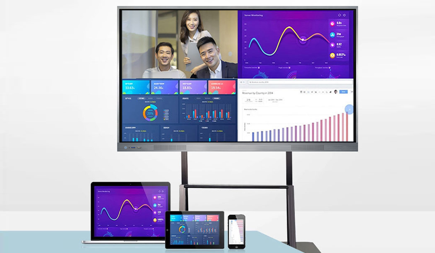 智能會議平板具有無線投屏功能,手機連接WiFi或進入APP即可投屏,電腦則可利用投屏器進行一鍵投屏。且支持多終端、多設備同時投屏,在需要數據對比、方案對比的場合,往往能發揮重要作用。