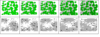 不同太陽角度下的冠層陰影(上:相機在冠層上部看到圖像,相機高度29米;下:相機在冠層下部看到圖像,其中黑色部分為樹干,相機高度4.5米。)